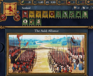 When the Auld Alliance is active, it will give bonuses to both France and Scotland when they coordinate wars together. The modifiers are extra generous to AI players because England can be a hard nation to take down when played by a human player with the 1215 start. If England is played by an AI player, it helps create a situation of parity between England and it’s opponents, creating a situation that was similar to the world of the 14th century prior to the Black Death.